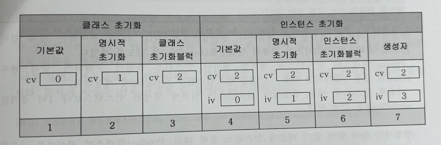 - 클래스 변수의 초기화 순서: 기본값(default) -> 명시적초기화 -> 클래스 초기화 블럭